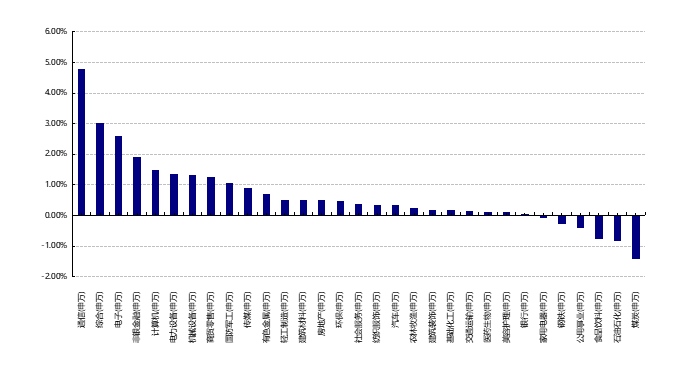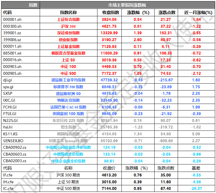 31個(gè)申萬一級(jí)行業(yè)中有25個(gè)行業(yè)上漲。其中,通信(申萬)、綜合(申萬)、電子(申萬)表現(xiàn)居前,漲跌幅分別為4.79%、3.03%、2.60%,食品飲料(申萬)、石油石化(申萬)、煤炭(申萬)表現(xiàn)居后,漲跌幅分別為-0.78%、-0.84%、-1.43%。滬市有1314只個(gè)數(shù)上漲,占比66.53%,深市有1864只個(gè)數(shù)上漲,占比67.76%。非ST個(gè)股中,77只個(gè)股漲停,4只個(gè)股跌停。股指期貨主力合約3個(gè)合約均上漲,其中,0只期指好于現(xiàn)貨指數(shù)。