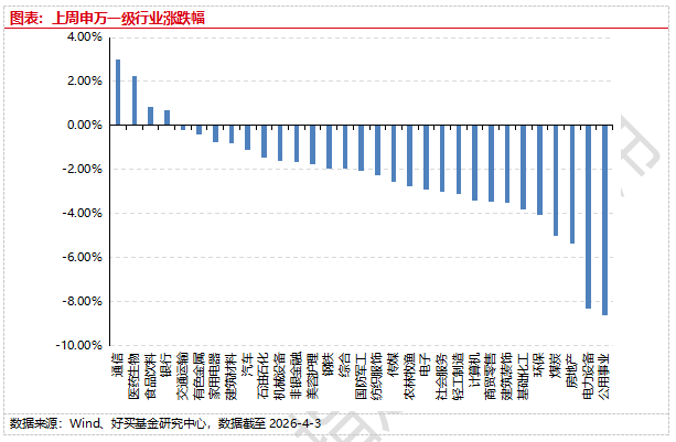 好買說:上周,滬深兩市雙雙收跌。截止收盤,上證綜指收于3880.10點(diǎn),跌33.63點(diǎn),跌幅為0.86%;深成指收于13352.90點(diǎn),跌407.46點(diǎn),跌幅為2.96%;滬深300收于4440.79點(diǎn),跌61.78點(diǎn),跌幅為1.37%;創(chuàng)業(yè)板收于3149.60點(diǎn),跌146.28點(diǎn),跌幅為4.44%。31個(gè)申萬一級(jí)行業(yè)中有4個(gè)行業(yè)上漲。其中,通信、醫(yī)藥生物、食品飲料表現(xiàn)居前,房地產(chǎn)、電力設(shè)備、公用事業(yè)表現(xiàn)居后。