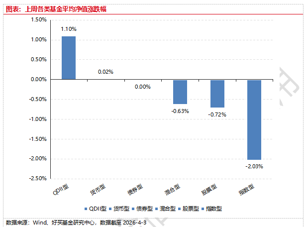 上周,國內(nèi)權(quán)益基金普跌,其中指數(shù)型基金下跌2.03%,混合型和股票型基金分別下跌0.63%和0.72%。